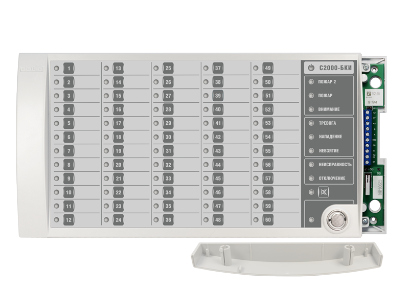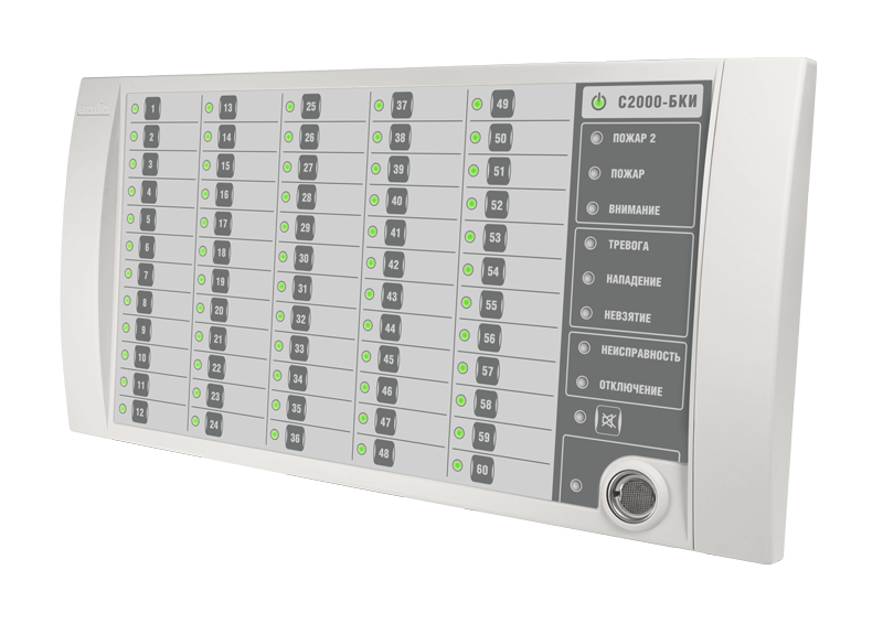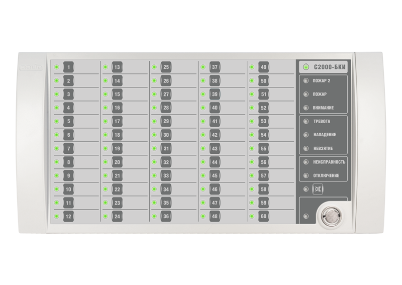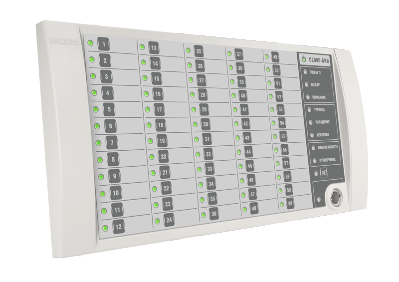 • 60 двухцветных индикаторов, отображающих состояния до 60 разделов пожарной, охранной, технологической сигнализации или исполнительных устройств противопожарного оборудования