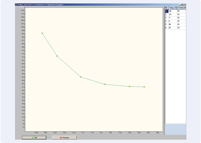 Такой график по шести точкам позволяет более точно настроить тепловой баланс здания. Другой подобный график позволит настроить компенсацию температуры подачи теплоносителя в зависимости от превышения температуры обратной воды.