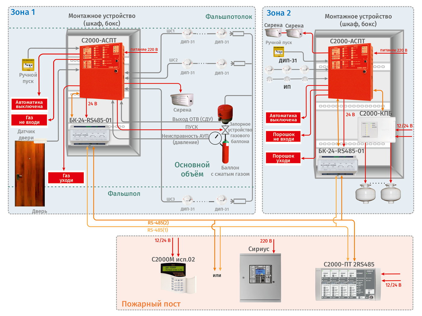 Реализация систем пожаротушения большого числа зон.Также ППКУП «Сириус», применяемые в АУП в качестве приборов управления, не рекомендуется одновременно использовать, как сетевой контроллер в других системах СПА объекта (СПС, СОУЭ, СПДВ). Приборы «Сириус», управляющие АУП, объединяются интерфейсом верхнего уровня с приборами «Сириус», управляющими другими СПА, для вывода сигналов на пожарный пост.