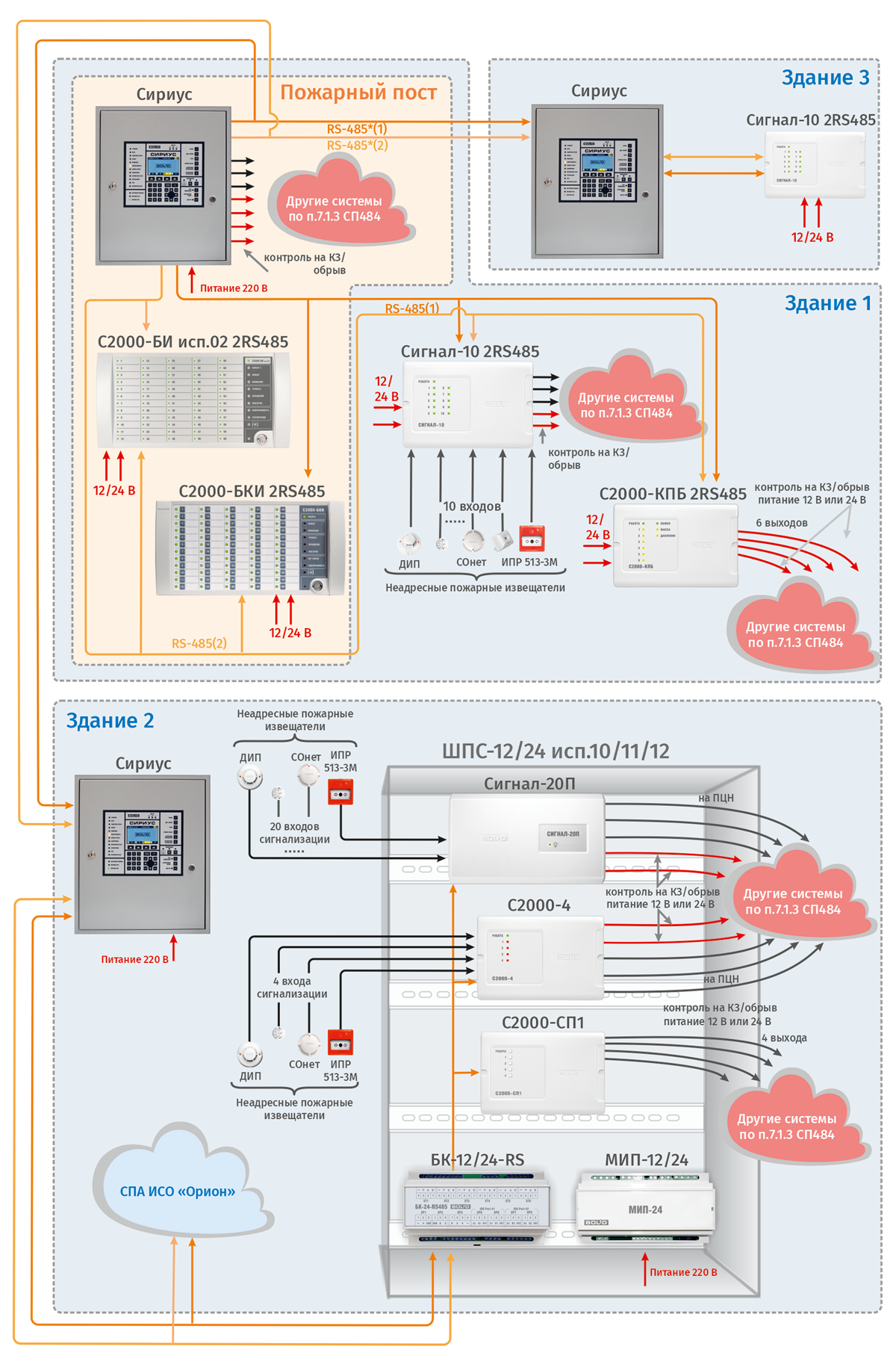 Требования СП 484 в части единичной неисправности линий связи обеспечиваются наличием в пульте «С2000М исп.02» и «Сириусе» резервированного интерфейса RS- 485, который также поддерживают блоки индикации, приемно-контрольный блок «Сигнал-10 2RS485» и релейный блок «С2000-КПБ 2RS485». Таким образом, для СПА рекомендуется применять «Сигнал-10 2RS485». Приемно- контрольные блоки «С2000-4», «Сигнал-20П», релейные блоки «С2000-СП1», «С2000-СП1 исп.01», размещаются в шкафах серии «ШПС-12» и «ШПС-24».