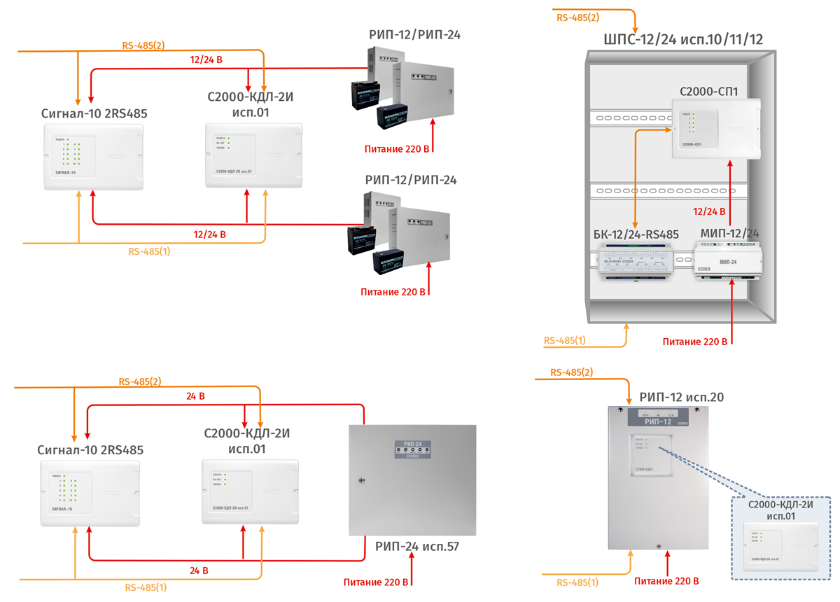 Альтернатива резервированию линий питания – размещение функциональных блоков в шкафах или боксах со встроенными ИБЭ с АКБ. Рекомендуется использовать шкафы серии «ШПС». Кроме того, блоки «С2000-КДЛ-2И исп.01», «Сигнал-10 2RS485», «С2000-КПБ 2RS485», могут устанавливаться внутрь ИБЭ «РИП-12 исп.20» (выходной ток 1 А, резерв от АКБ 7 А*ч). См. рис.