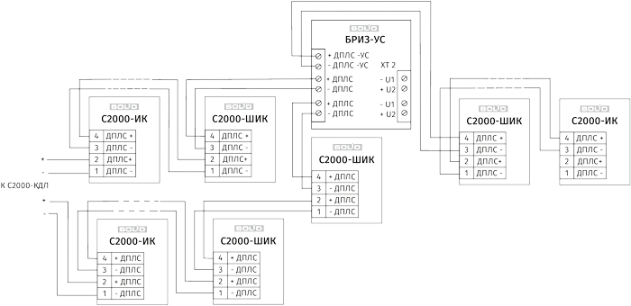 Для обеспечения дополнительного тока нагрузки в ДПЛС и увеличения максимальной длины ДПЛС применяются блоки разветвительно-изолирующие с усилителями сигнала «БРИЗ-УС». Они имеют три защищенных друг от друга изоляторами КЗ порта адресной линии: два для включения в кольцо и один для организации ответвления. Усиленное ответвление будет фактически являться новой линией ДПЛС, по которой можно будет запитать АУ суммарным током 64 мА (максимальный ток – не более 84 мА), и длина которой будет аналогична длине ДПЛС блока «С2000-КДЛ». Всего в кольцо можно включать до 8 блоков «БРИЗ-УС». «БРИЗ-УС» требует внешнее питание 12 / 24 В.