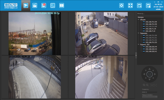 Пример рабочего интерфейса в АРМ Орион Про, применяемый в системах видеонаблюдения, изображен на рис.